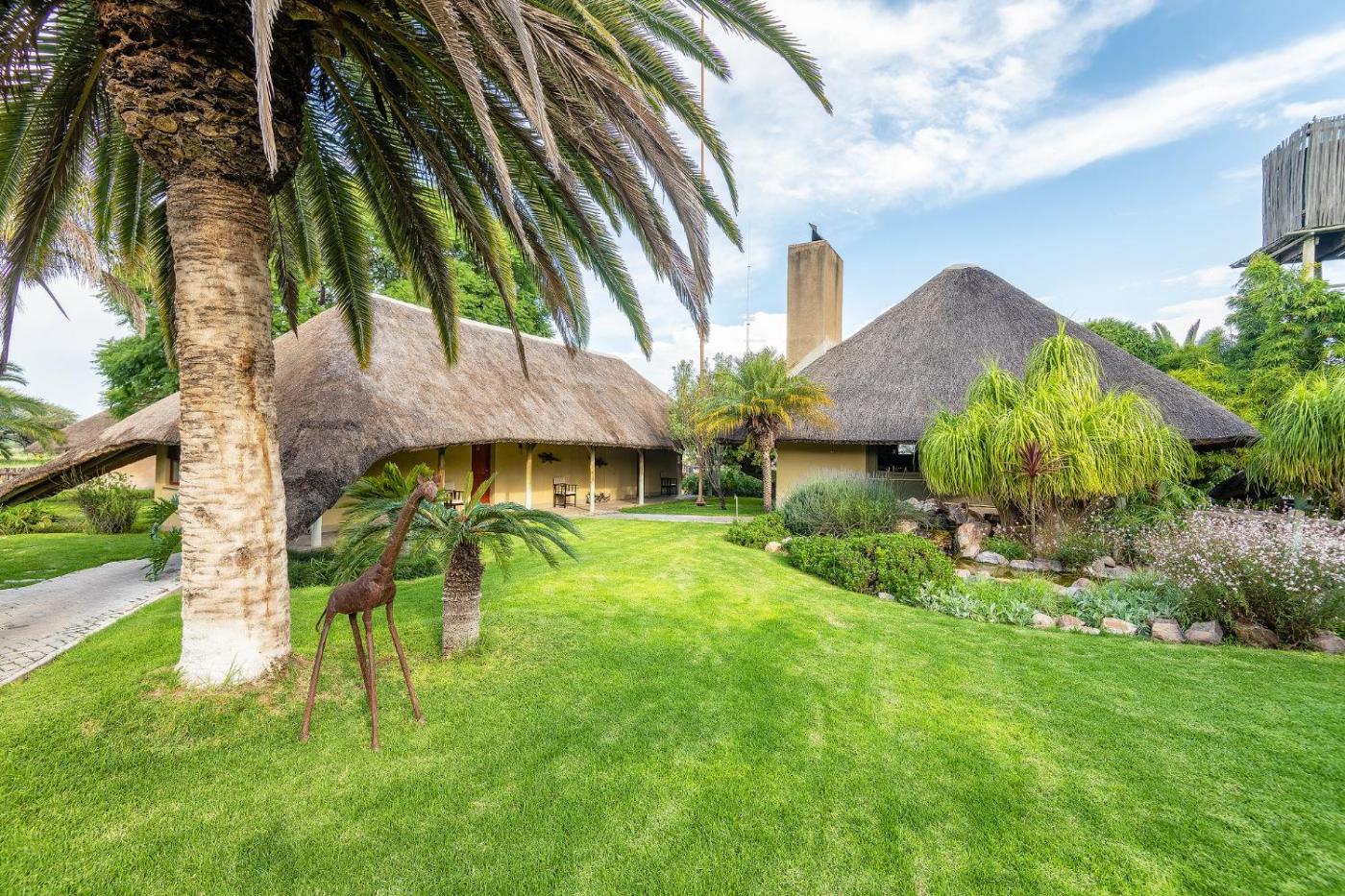The lodge and rooms were built from materials like natural stone, wood, and reed that were used for building houses in the Ovambo tribes. Items of daily use in the Ovambo tribe (e.g., earthen pots, voluminous storage baskets, and original wooden figures) serve as decoration to emphasise the African theme, lending a very special charm to the lodge.